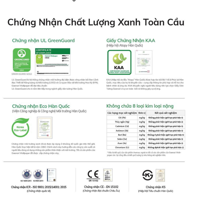 Tất cả sản phẩm tại K.Wall đều có chứng nhận xanh, không chứa formaldehyde, chì, thủy ngân hay các chất độc hại khác. Quý khách hàng hoàn toàn yên tâm sử dụng cho cả phòng trẻ em và người cao tuổi.