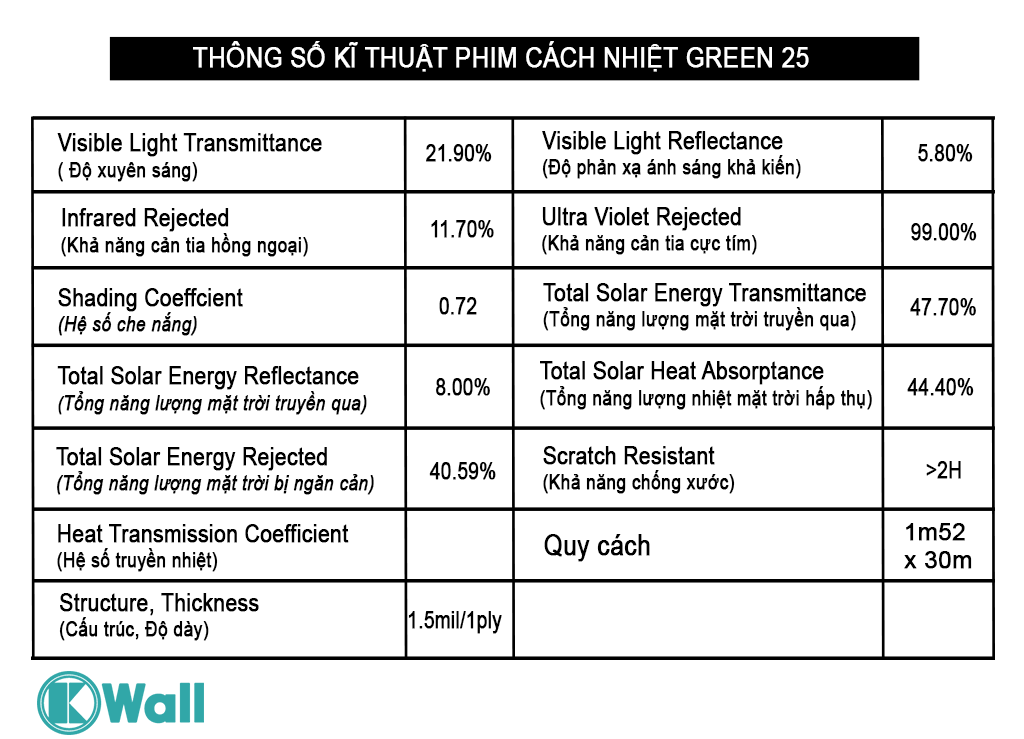 I. THÔNG SỐ KĨ THUẬT PHIM CÁCH NHIỆT Green 25