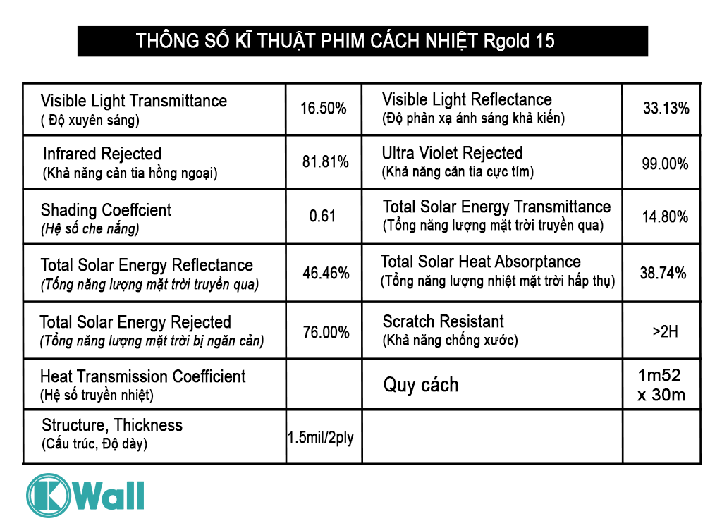 I. THÔNG SỐ KĨ THUẬT PHIM CÁCH NHIỆT Rgold 15