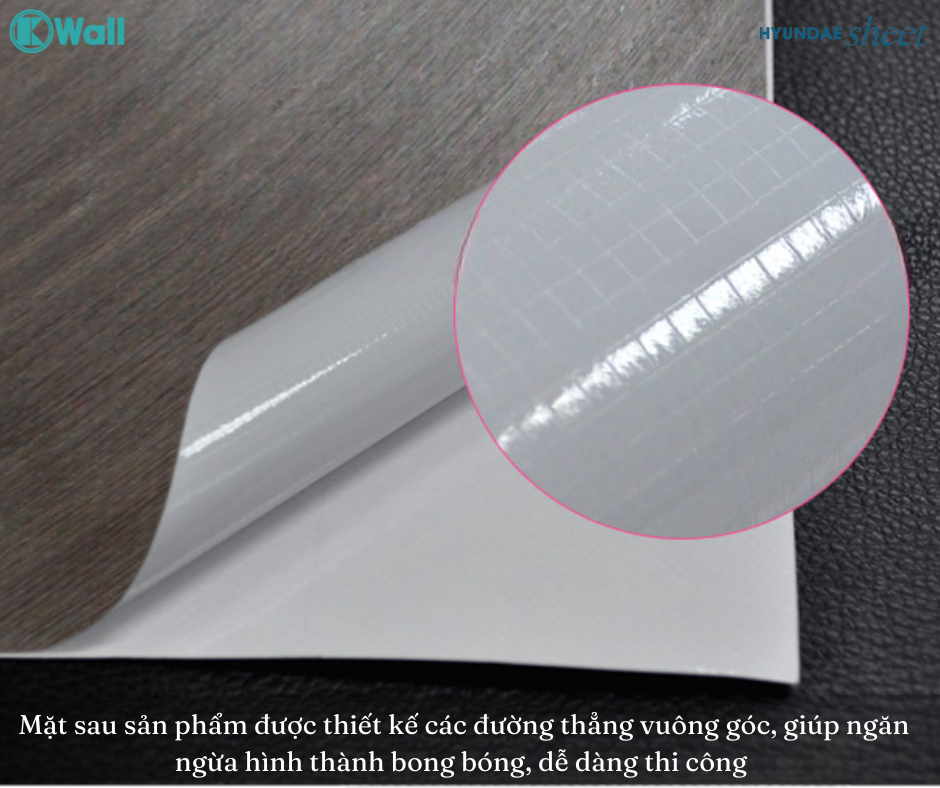 | Chất liệu và cấu tạo | - Lớp Nền (Base Layer): Đây là lớp cơ bản của phim, cung cấp độ bền và độ dẻo cho phim. Sử dụng PVC an toàn cho sức khỏe và môi trường. - Lớp In (Printed Layer): Lớp này chứa hình ảnh, mẫu mã hoặc hoa văn được in trên bề mặt của phim. - Lớp Bảo Vệ (Protective Layer): Đây là lớp bảo vệ được áp dụng phía trên lớp in, giúp bảo vệ hình ảnh khỏi trầy xước, bám bụi và mài mòn do sử dụng hàng ngày. - Lớp Keo (Adhesive Layer): Lớp keo được áp dụng phía sau phim, giúp dính chặt vào bề mặt cần dán. Huyndaesheet sử dụng keo an toàn cho sức khỏe, ko chứa Formaldehyde - Lớp Bảo Vệ Phía Dưới (Backing Layer): Đây là lớp bảo vệ phía dưới phim dán, giúp bảo quản keo và dễ dàng tháo ra khi cần thiết. |