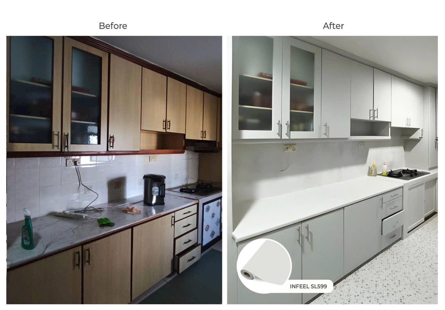 - Tủ bếp cũ ố vàng → Dán phim vân gỗ hoặc màu trắng matte: Như mới hoàn toàn chỉ trong 1 ngày